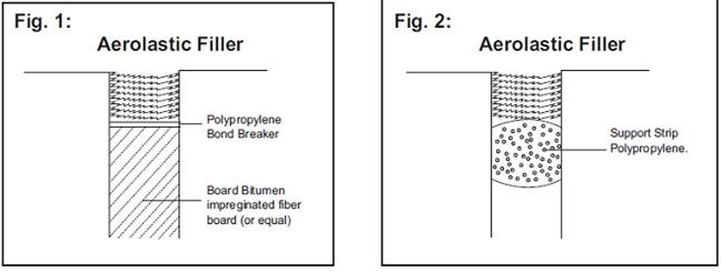 Compressed fiber filler boards impregnated in bitumen or cork sheet boards or poly propylene rods or thermopore sheets be inserted inside the expansion joint up to the required depth and bond breaking polyethylene tape should be inserted on top of boards to prevent the sealant to adhere with the filler board. This will ensure flexibility of the sealant. See Fig.1